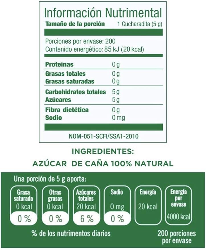 1 cucharadita (5 g) de Azúcar Moreno contiene 19 calorías (kcal), 0.0 g grasas, 4.9 g carbohidratos y 0.0 g proteínas.